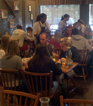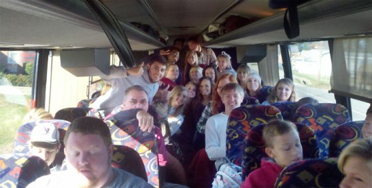 Two spirit buses of Chiefs fans pulled out of Northview High School this morning on their way to Jacksonville for tonight’s Region 1-A playoff game. Pictured left: The Chief take over a Cracker Barrel along the way. Pictured below: Decorating a bus.