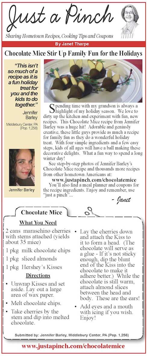 This weekend’s featured recipe from Janet Tharpe is a “Chocolate Mice”, a fun and easy idea with just four simple ingredients and a few easy steps. Kids of all ages will have fund making (and eating) these decorative delights.