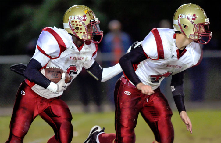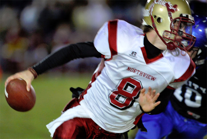 The Chiefs (11-2) took the lead with 5:47 to go in the first quarter on a 12-yard touchdown run from Dustin Yuhasz to cap an 80-yard, six minute drive. The point after kick was blocked, and Northview held a 6-0 lead. But on the next sequence, Trinity answered with a 12-yard touchdown run of their own and a good kick. The Conquerors were on top 7-6 at the end of the first quarter.