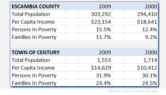 The U.S. Census Bureau data shows Century’s population declined just under 10 percent during the period, from 1,714 to 1,553. During the same 2000 to 2009 period, Escambia County’s population increased about three percent, from 294,410 to 303,292.