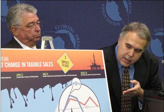 Pictured top: Kurt Wenner, president of tax research for Florida TaxWatch, briefs reporters on the freefall of retail sales in the Florida Panhandle. Florida Retail Federal President Rick McAllister (left) said the organization has asked BP to pay for series of sales tax holidays to boost sales in the region. Photo by Michael Peltier for NorthEscambia.com, click to enlarge.
