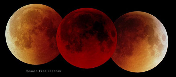 Pictured above: Path and times local to North Escambia for the eclipse, click to enlarge. Pictured below: The Total Lunar Eclipse of July 16, 2000 was a very long total eclipse (1 hour 47 minutes) that won’t be exceeded for over a thousand years. Courtesy Fred Espenak/NASA’s Goddard Space Flight Center for NorthEscambia.com, click to enlarge.