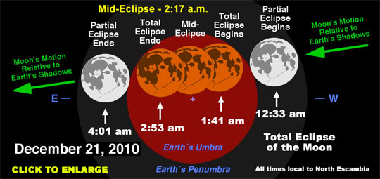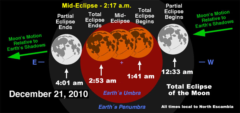 From beginning to end, the eclipse will last about three hours and twenty-eight minutes. For observers in the North Escambia area, the eclipse lasts from 12:33 a.m. through 4:01 a.m. Totality, the time when Earth’s shadow completely covers the moon, will last a lengthy 72 minutes.