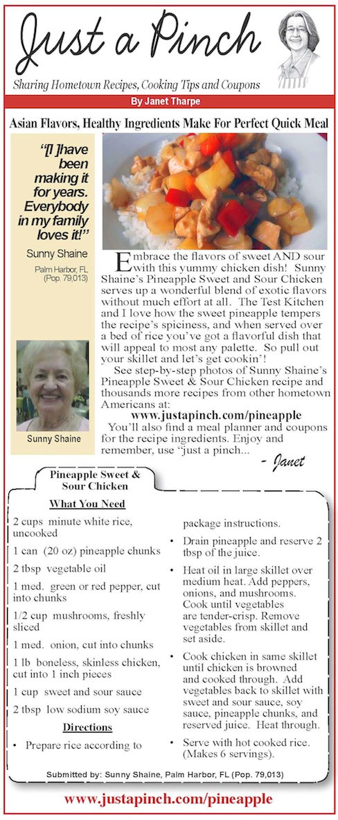 This weekend’s featured recipe from Janet Tharpe is a “Pineapple Sweet and Sour Chicken”, a simple dish with exotic flavors that will appeal to most any palette.