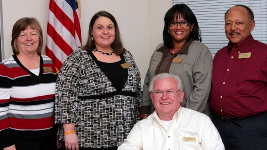 Pictured top: Century Town Council members (L-R) Jacke Johnson, Gary Riley and Sandra McMurray Jackson take the oath office Monday night. Pictured below: A council group photo with Mayor Freddie McCall (seated) and (L-R) Ann Brooks, Jacke Johnston, Sandra McMurray Jackson and Gary Riley. Not pictured: Council Member Nadine McCaw. NorthEscambia.com photos, click to enlarge.