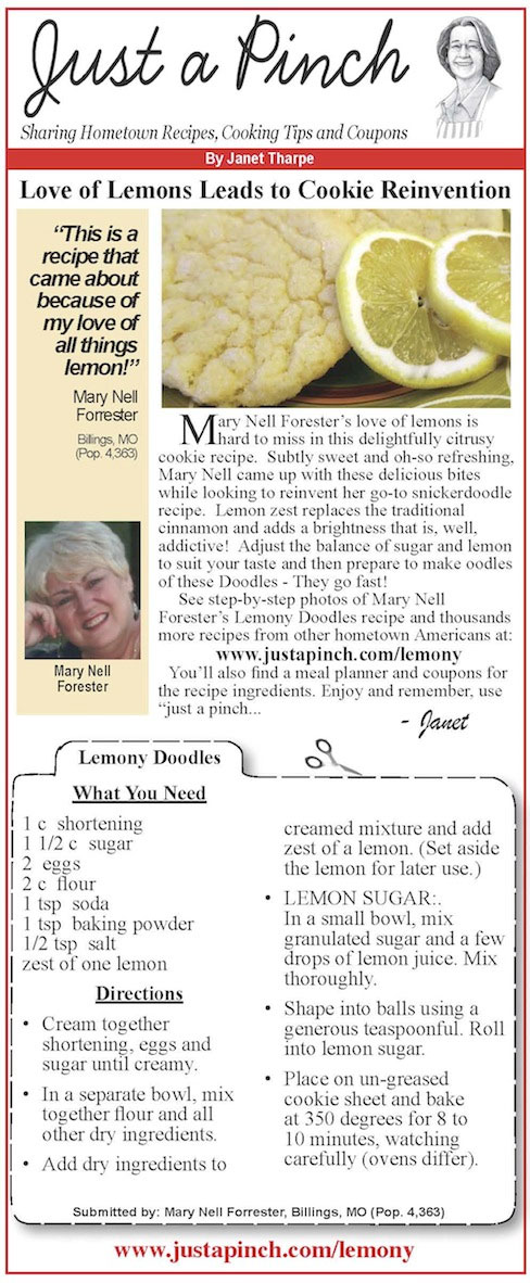This weekend’s featured recipe from Janet Tharpe is “Lemony Doodles” — think lemon cookies and snickerdoodles.