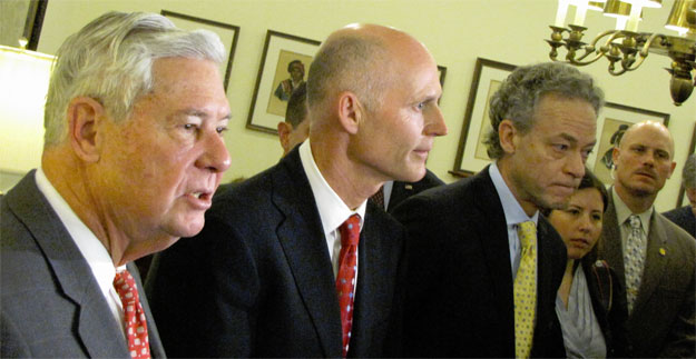 Pictured: Gov. Rick Scott, center, and former U.S. Senator Bob Graham, left, speak to reporters after meeting to discuss the findings of the National Oil Spill Commission, co-chaired by Graham. Photo by Mike Peltier for NorthEscambia.com, click to enlarge.