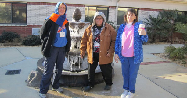 Pictured above: A frozen-over fountain at Century Care Center this morning. Pictured below: Century Care Center employees brave the cold to pose with the fountain to they can get their picture on NorthEscambia.com. Submitted photos, by Mae Hildreth for NorthEscambia.com click to enlarge.