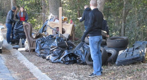 Pictured above: Sheriff David Morgan (near horse) and deputies from the Escambia County Sheriff’s Office prepare for the clean up of Frontera Circle in Warrington Thursday morning. Pictured below: Volunteers collected mounds of trash from the neighborhood in just a short time. Photos for NorthEscambia.com, click to enlarge.