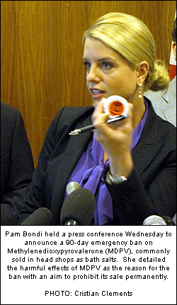 Under the new ban, which Bondi said takes effect immediately, possession or distribution of the MPDV bath salts will be a schedule 1 felony, punishable by one to three years in prison.