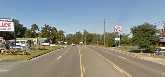 Pictured: A portion of Highway 29 in Century. Decades-old natural gas line is buried under the southbound lanes on the left and is leaking somewhere between this location and West Highway 4, over a mile away. Pictured inset: Century Mayor Freddie McCall motions toward Highway 29 just outside the Century Town Hall. NorthEscambia.com photo, click to enlarge.