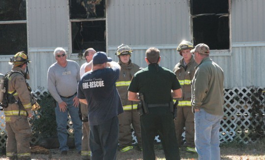 Pictured top: Smoke pours from a Molino Road mobile home Sunday morning. Pictured inset: James Norman Brown, the man inside the home at the time of the fire, is questioned by an officer from the Florida State Fire Marshal’s Office. Pictured below: Firefighters discuss their findings with an Escambia County deputy. NorthEscambia.com photos, click to enlarge.