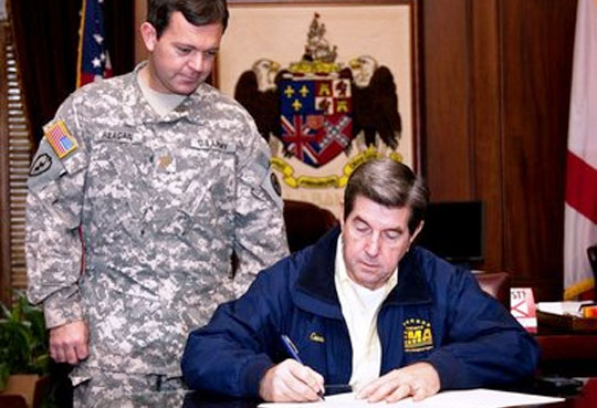 Pictured: Gov. Bob Riley declared a state of emergency in the entire state of Alabama due to an approaching winter storm. Watching the signing is Sonny Reagan, the governor’s legal advisor and a major in the Alabama National Guard. Courtesy photo for NorthEscambia.com, click to enlarge.