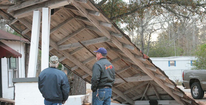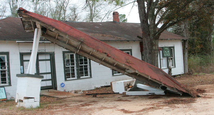 His Chevrolet Malibu struck a support pillar of an old brick and wooden gas pump awning, sending one end of the awning crashing to the ground. The vehicle continued a short distance away from the building, coming to rest upright alongside Highway 29.
