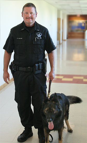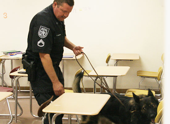 Pictured: Escambia County Sheriff’s Office Master Deputy Wayne Gulsby performs a drug dog search at Northview High School. NorthEscambia.com file photos, click to enlarge.