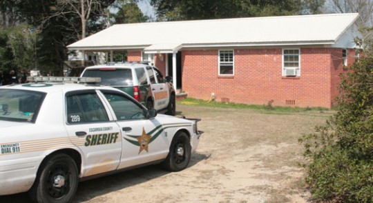 Pictured top: An alleged meth lab was located Tuesday morning at this home at 484 Molino Road. Pictured inset: An officer enters the home in protective gear. Pictured below: Allged liquid meth was found in the Mason jar below. Investigators tranferred the liquid into the smaller plastic bottle for evidence. NorthEscambia.com exclusive photos, click to enlarge.