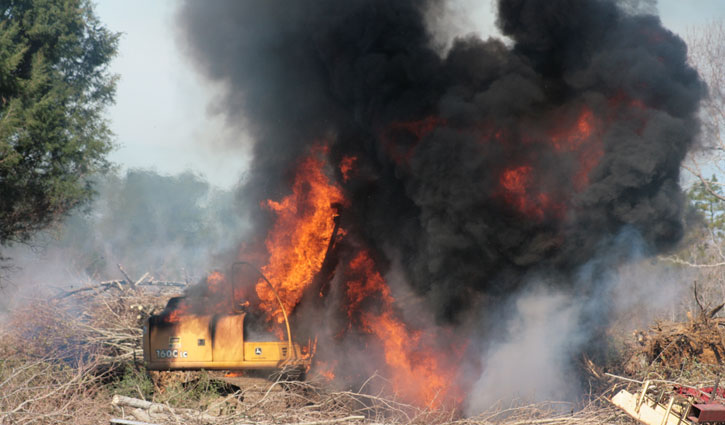 Pictured top: The reported bulldozer fire was out before firefighters arrived. Pictured inset: Firefighters wet down the bulldozer to ensure the fire was out. Note: The smoke seen in both photos above is from a pile of brush behind the bulldozer. Pictured below: An excavator burns at the same work site Monday morning. NorthEscambia.com photos, click to enlarge.