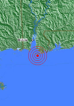 The earthquake, confirmed by the U.S. Geological Survey, was centered less than 10 miles off the coast in the Gulf of Mexico at 5:15 p.m. The quake center was about 35 miles from Mobile, 40 miles from Pensacola, or about 48 miles from Molino.