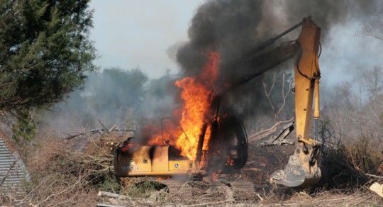 In the photo above, fuel or fluid from the excavator explodes into a fireball before the first fire units arrived on scene. Pictured below: The excavator burns less than second before the top photo. NorthEscambia.com exclusive photos, click to enlarge.