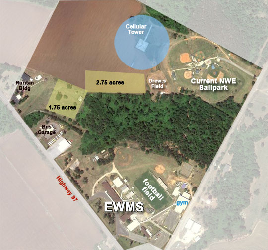 The school district owns 90 acres around Ernest Ward, including the current school campus, the NWE’s current Bradberry Park, about 20 acres of farmland and several acres of wooded land (see map above). A portion of the property was already leased to NWE for Bradberry Park, a portion to a communications company for a cellular tower and 19.25 acres to Bama Bottom Farms, LLC.