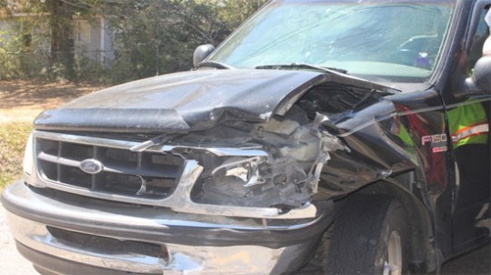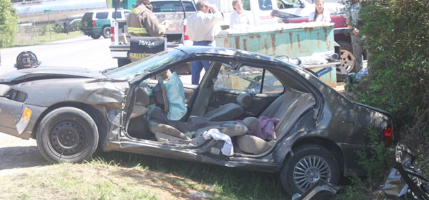 Pictured top: First responders work to free a driver trapped in an accident Friday afternoon on Old Chemstrand Road. Pictured inset and below: Two people were injured in this wreck. NorthEscambia.com photos by Kristi Smith, click to enlarge..