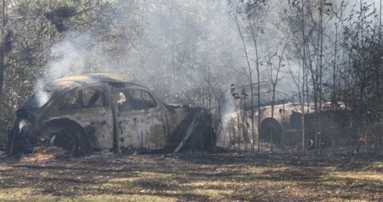 Firefighters from several stations of Escambia Fire Rescue battled a brush and debris fire Tuesday afternoon on Pine Top Lane near Neal Road in Cantonment. The fire consumed a portion of an old shed and several abandoned vehicles. There were no injuries reported.