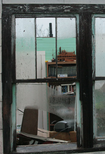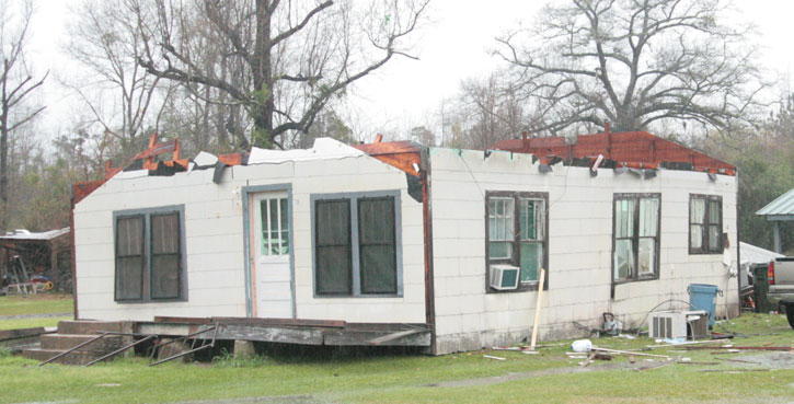 Pictured top: The roof was ripped from James Milstead’s McDavid home as the entire house shift several inches off its foundation. Pictured top inset: Milstead details his ordeal. Pictured bottom inset: Looking through a broken window of Milstead’s home into a room and up into the open sky. NorthEscambia.com photos, click to enlarge.