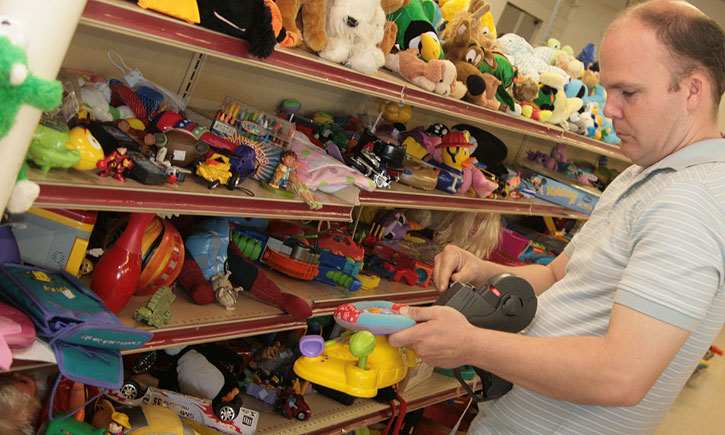 Pictured top: Pastor Jason Lee prices toys recently at the Molino Outreach Ministry Thrift Store. Pictured inset: The store occupies the former Grocery Advantage building on Highway 29 at Molino Road. NorthEscambia.com photos, click to enlarge.