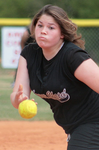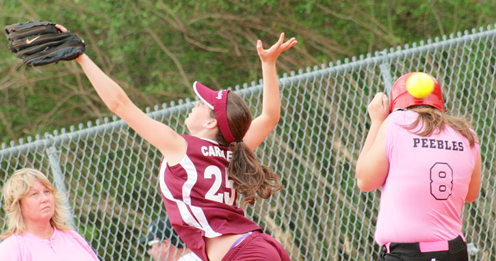 Pictured top: Molino Sandy Sansing’s Lauren Carnley missed a catch at third as the ball grazes the helmet of Northwest Escambia Alto’s Liberty Peebles. Pictured inset and below: More action from opening day at the Molino Ballpark. NorthEscambia.com photos, click to enlarge.