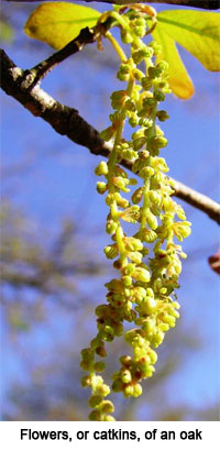 All members of the Quercus genus are known to produce large amounts of pollen, making both deciduous and evergreen oaks highly, to extremely, allergenic. One way of knowing when the oak trees are blooming is the appearance of yellow pollen on your car, sidewalk or pool. Following the bloom, oak flowers, known as catkins, drop to the ground and accumulate along curbs.