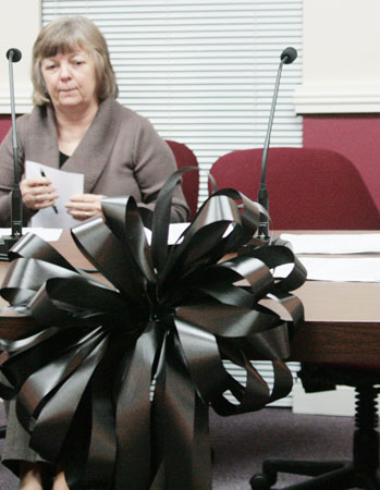 Pictured: Council President Ann Brooks looks at a black ribbon in front of the late Sharon Scott’s former seat the Century Town Council table. NorthEscambia.com photo, click to enlarge.