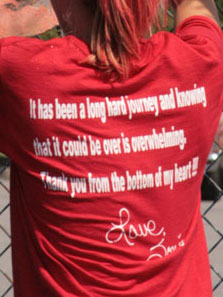 Many wore red t-shirts, emblazoned with words “I helped Sonja Kick Cancer” on the front and “It has been a long hard journey and knowing that could be over is overwhelming. Thank you from the bottom of my heart. Love Sonja.”