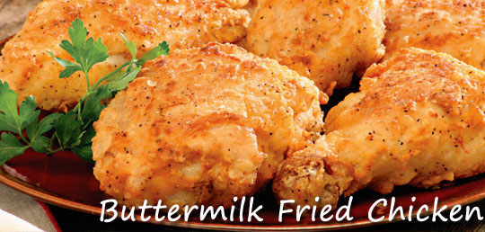 - In large paper bag, combine flour, black pepper, cayenne pepper and salt. Pour buttermilk into bowl or shallow dish. Dip each chicken piece in buttermilk and then place into paper bag. Shake bag to coat chicken evenly with flour. Remove chicken to wire rack and let dry 15 minutes.