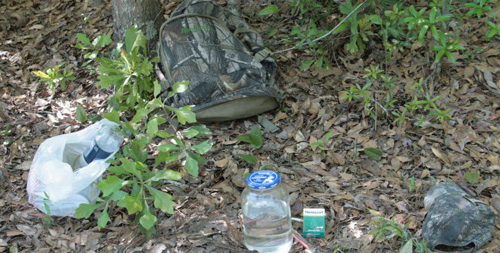 As deputies discovered the alleged methamphetamine lab, they gave chase to suspects that ran from the scene. A portion of the meth lab — the bottle used in the actual manufacturing process — was tossed into a nearby stream.