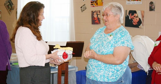 Pictured: Laura Knisbell receiving a homemade gift of jams from Becky Dorch. Submitted photo by Terri Brown for NorthEscambia.com, click to enlarge.