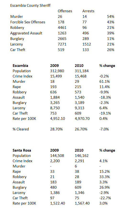 Escambia County’s crime rate dropped two-tenths of a percent from 2009 to 2010, while Santa Rosa’s rate increased by 4.1 percent. Murders, rapes and larceny increased in Escambia County, while the number of robberies, assaults, burglaries and vehicle thefts decreased.