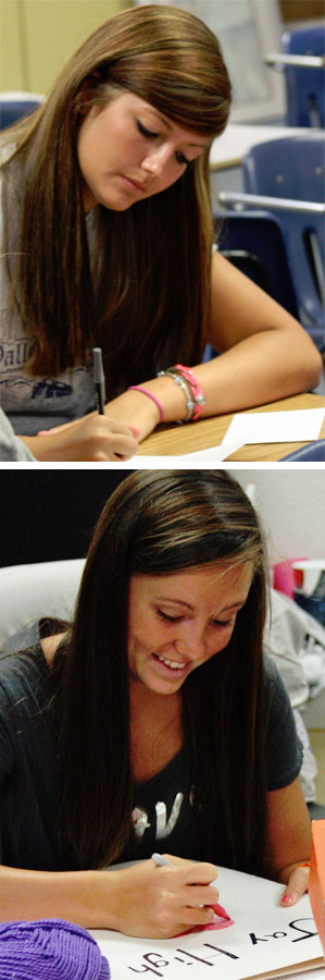 Pictured top: The Jay High School varsity cheerleaders created personal care packages for each member of a cheerleading squad in the town of Phil Campbell, Alabama, which was devastated last month by a tornado. Pictured top inset: Camille Driver writes a note to her “adopted” Phil Campbell cheerleader. Pictured bottom inset: Hanna Roberts works on a card for the PCHS squad. Pictured below: Some of the care packages. Submitted photos for NorthEscambia.com, click to enlarge.