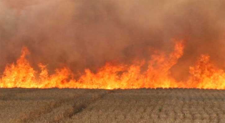Pictured top: A field of corn is irrigated recently at Highway 4 and Dortch Road in Bratt. Pictured below: This file photo shows a wildfire raging through a North Escambia wheat field. NorthEscambia.com photos, click to enlarge.