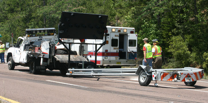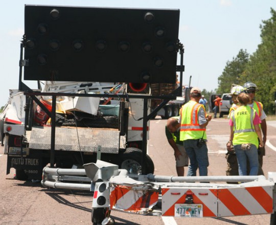 I am the wife of the truck driver and he was hurt in this accident, he has a severe whiplash and muscle strain. This man did everything he could to avoid an accident. There were no warning signs along the highway warning drivers of workers present, no flagman, nothing but a lighted arrow on the back of a truck around a blind curve. Why were there no signs present warning of right lane closed ahead or workers present. He was not speeding, the posted speed limit is 65 and he was going 60. He came around this curve, saw the truck in the right lane, let off the fuel because he thought they were moving, he could not get over because there was a car beside him, when he realized they were stopped(the 4-wheeler blowing off the loose rocks from the highway was pulled off the road, why was the pickup stopped in the highway? Why didn’t he pull off on the turning lane) he immediately slammed on his brakes, but you have got to realize that a truck carrying around 80,000lbs cannot stop on a dime. He swerved to miss the pickup and realized he was headed into on coming traffic.