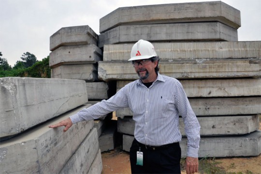 Pictured: Alan Steele, special projects supervisor with Gulf Power, stands with a portion of the concrete and aluminum lids the company is donating to Escambia County Marine Recreational Committee to be used as foundation for an artificial reef. Concrete culverts will cover the lids once deployed on the sea floor. Submitted photo for NorthEscambia.com, click to enlarge.