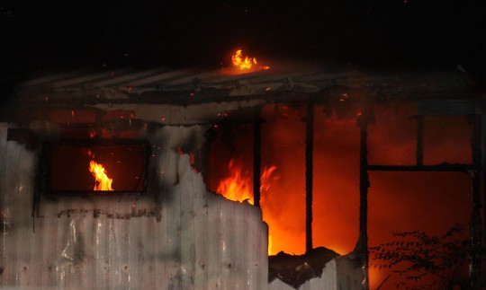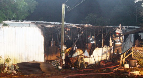 Pictured top: Fire destroyed this mobile home near Molino early Friday morning. Pictured inset: Fire rages inside the mobile home as firefighters arrive (Kristi Smith photo). Pictured below: Firefighters sift through the remains of the residence. NorthEscambia.com photos, click to enlarge.
