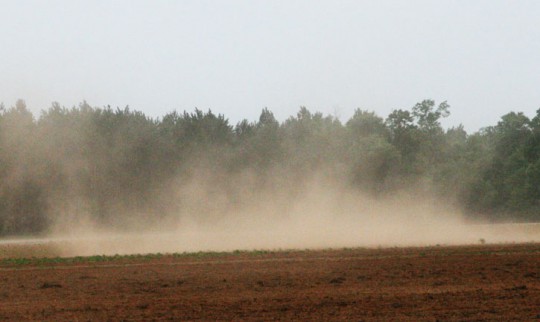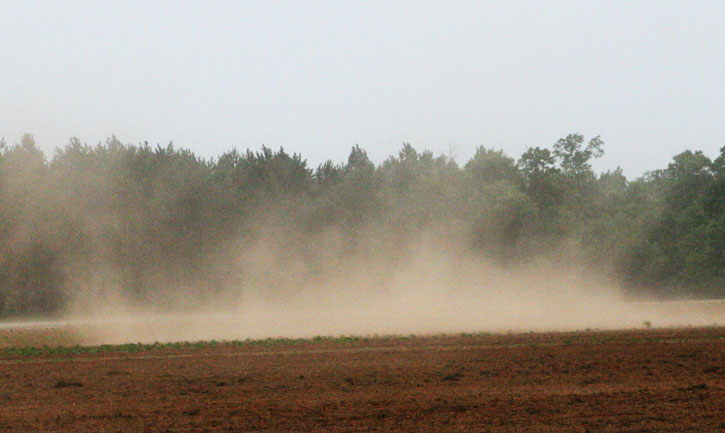 A dust storm of sorts struck in portions of North Escambia Friday afternoon as strong southerly winds picked up large amounts of dust from newly plowed fields. The strong winds before approaching rain also downed power lines and trees.