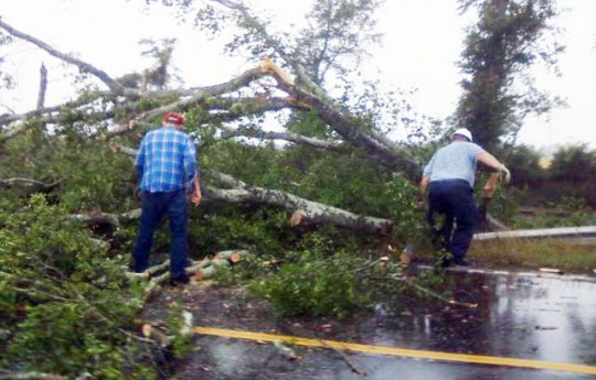 Pictured above: This photo shows a large dust devil spinning through a Walnut Hill field. Pictured below: This photo (courtesy Katie Fowler) shows a tree downed on Highway 31 near Old Atmore Road west of Flomaton. NorthEscambia.com photo, click to enlarge.