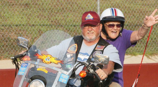 Pictured top: The Greater Escambia Relay for Life gets underway Friday night at Tate High School. Pictured inset: Members of the Jim Allen Elementary team cheer for survivors. Pictured below: A cancer survivor, right, takes her victory lap in style on motorcycle. NorthEscambia.com photos, lick to enlarge.