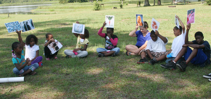 Pictured top: Getting hit by a water balloon a Water Camp Wednesday morning at Lake Stone. Pictured inset: Learning about water flow and erosion. Pictured below: Water Camp participants learn about the necessity of water in life. NorthEscambia.com photos, click to enlarge.