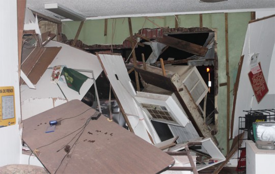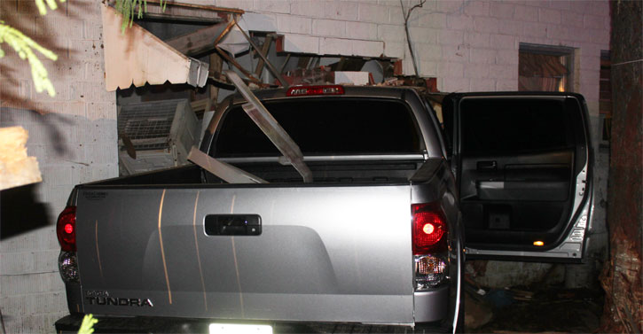 Pictured: A pickup crashed into a building on Chemstrand Road at East 10 Mile Road Wednesday night. NorthEscambia.com photos by Kristi Smith, click to enlarge.