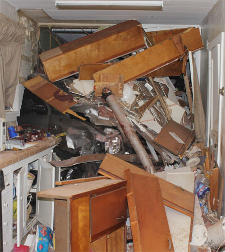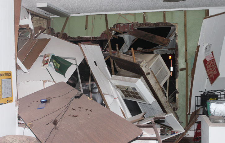 According to the Florida Highway Patrol, Thomaz Quasuan Johnson, 39, first hit the rear of a 2001 Mazda driven by Daniel Sage Desousa, 17, of Pensacola about 10:40 p.m. on Chemstrand Road. He fled the scene, crashing into two other vehicles and finally into a combination auto repair shop and home at the corner of Chemstrand and East 10 Mile roads. The front of his truck came to rest inside the concrete block building, causing significant damage.