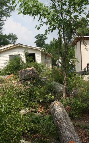 The tree was cut down by a tree service working in the area just after 10 a.m. As the tree fell, it caused power lines to fall and short on the back of a home in the 200 block of Bluff Springs Road. The lines also closed Bluff Springs Road. The resulting fire caused little damage, but led to a gas leak.