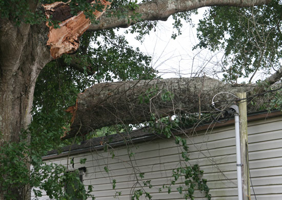 Pictured: A large oak limb sliced through a Bratt mobile home. NorthEscambia.com photos, click to enlarge.
