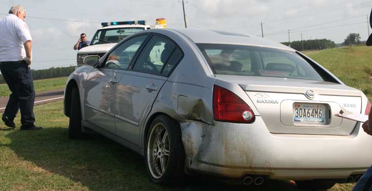 Pictured: The driver of this Jaguar (top) was killed after colliding with this 18-wheeler (below). A passenger in a third vehicle (pictured inset) was also injured in the wreck on Highway 21 at Fountain Prison in Atmore. NorthEscambia.com photos, click to enlarge.